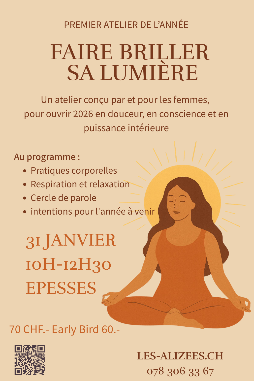 Le premier atelier de l’année, «Faire briller sa lumière», a été imaginé pour offrir exactement cela: une parenthèse régénérante, conçue par et pour les femmes, pour entrer en 2026 avec plus de présence, de clarté et de puissance intérieure.